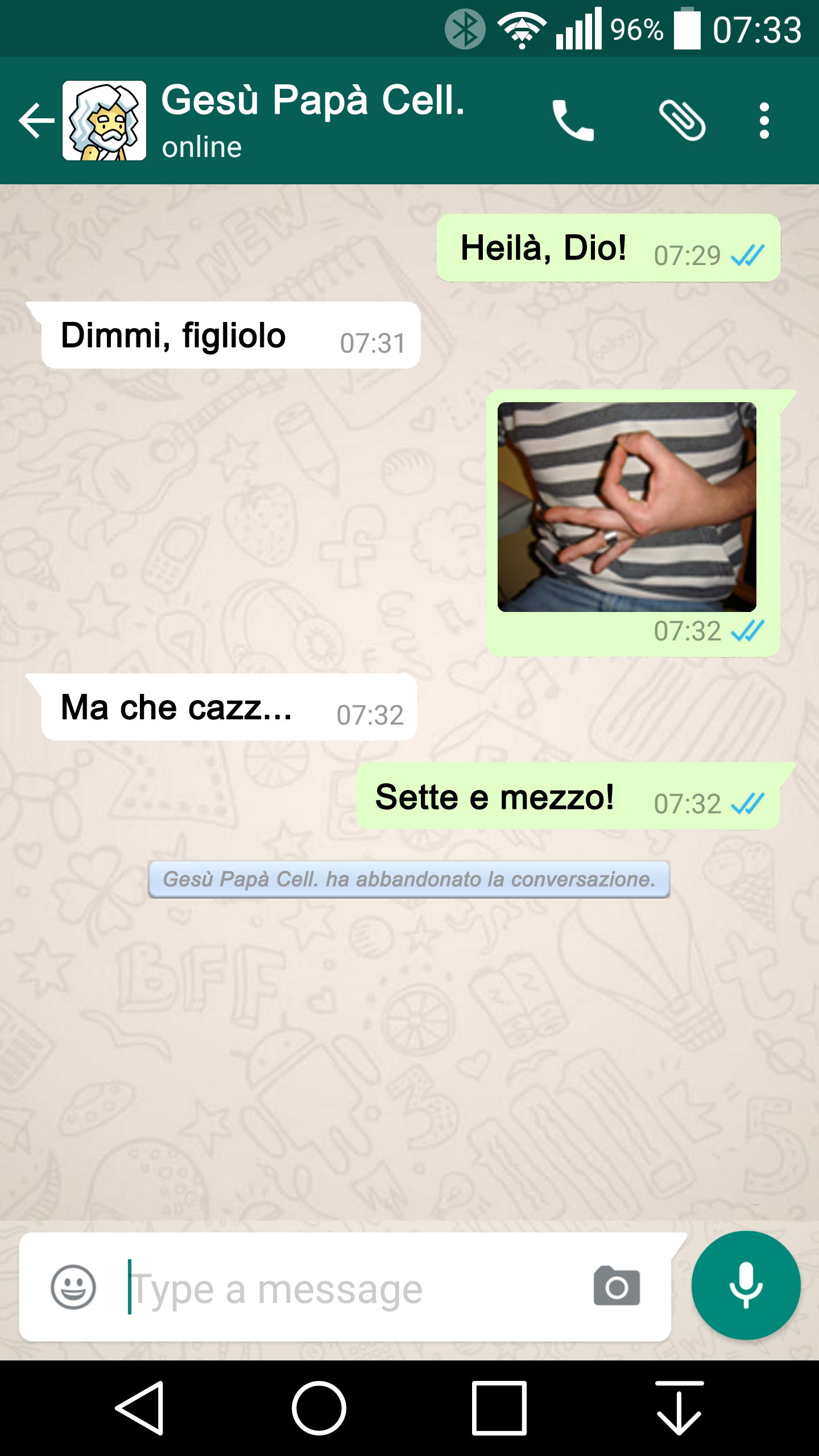 Peraltro, la faccenda si è complicata perché Dio era in riunione e mi ha concesso solo una breve whatsappata.